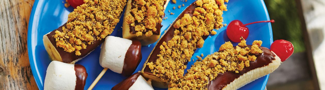 Dip 1 side of each halved banana into the melted chocolate then roll in the chopped cookies. Let stand for a few sec. to allow crumbs to adhere. Place on lined sheet to cool. Dip 1 end of each marshmallow in the chocolate and stand - chocolate-side up - on the sheet to cool 3 to 5 min.