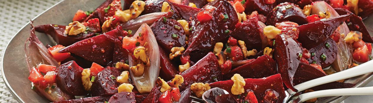 Lorsque les betteraves sont assez froides pour qu’on puisse les manipuler, retirer doucement la pelure en la frottant avec un essuie-tout. Couper les betteraves et les échalotes en quartiers, puis les mélanger avec la vinaigrette. Disposer les légumes dans un plat de service et les parsemer de noix.