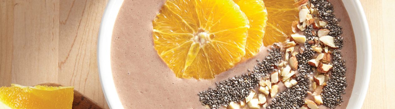 Garnir le smoothie des rondelles d’orange restantes, d’amandes et de graines de chia. Servir immédiatement.
