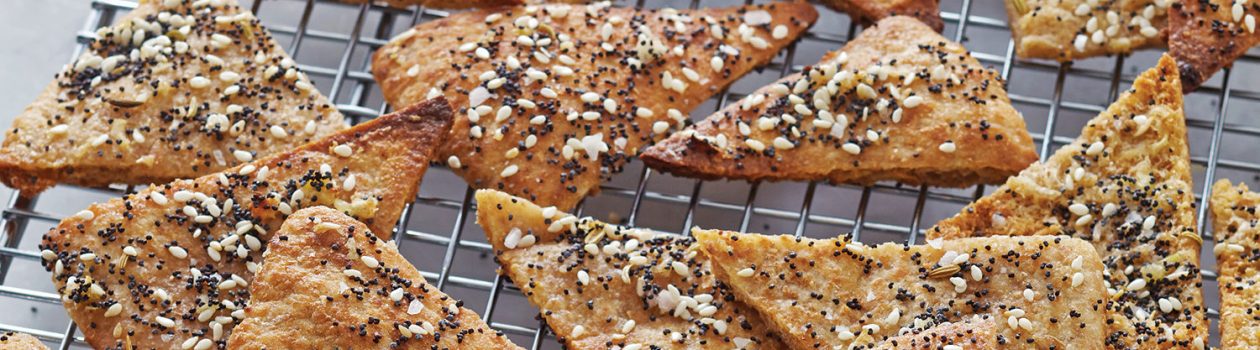Préchauffer le four à 190 °C (375 °F). Mélanger l’huile avec l’oignon et l’ail, puis en enrober les morceaux de pain pita. Les mettre en une seule couche sur 2 plaques à pâtisserie tapissées de papier parchemin. Les parsemer des graines de pavot, de sésame et de carvi, et de sel.