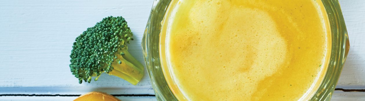 Passer les pommes, les tiges de brocoli et le gingembre à la centrifugeuse. Répartir le jus dans deux verres.