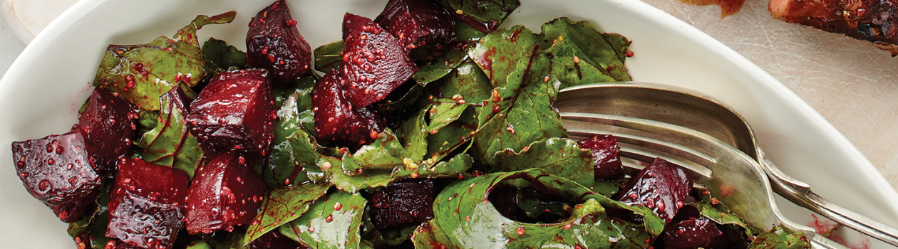 Couper les feuilles de betteraves en bouchées. Mélanger avec le reste de l’huile d’olive, le vinaigre, la moutarde, le sirop d’érable, le sel et le poivre.