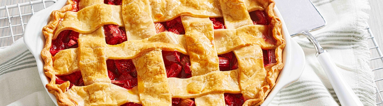 Meanwhile, roll remaining dough to ⅛-in. (3-mm) thickness. Use 2-in. (5-cm) diameter star cookie-cutter to cut out about 24 stars, re-rolling dough scraps once. Place cut-outs on parchment-lined baking sheet; freeze about 5 min. Meanwhile, in large bowl, toss rhubarb, strawberries, sugar, cornstarch, lemon zest, lemon juice and vanilla. Scrape mixture into pie shell (including juices in bowl).