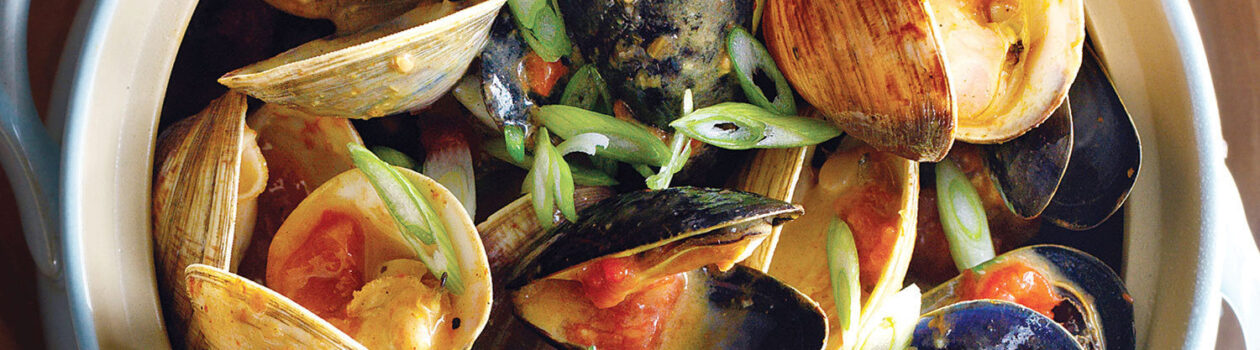 Spoon mussels and clams onto a large serving platter or into a bowl; spoon sauce overtop and garnish with green onions.