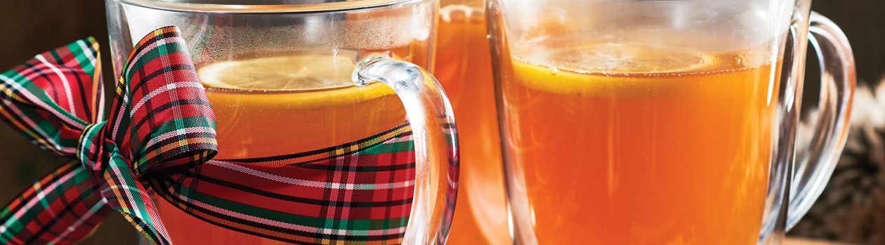 Dans une autre casserole, porter le jus de pomme à ébullition sur feu moyen-vif. Retirer du feu. Ajouter le bourbon, le jus de citron et la moitié du sirop réservé (conserver le reste du sirop au réfrigérateur pour un autre usage). Verser le toddy dans des tasses et décorer de tranches de citron.